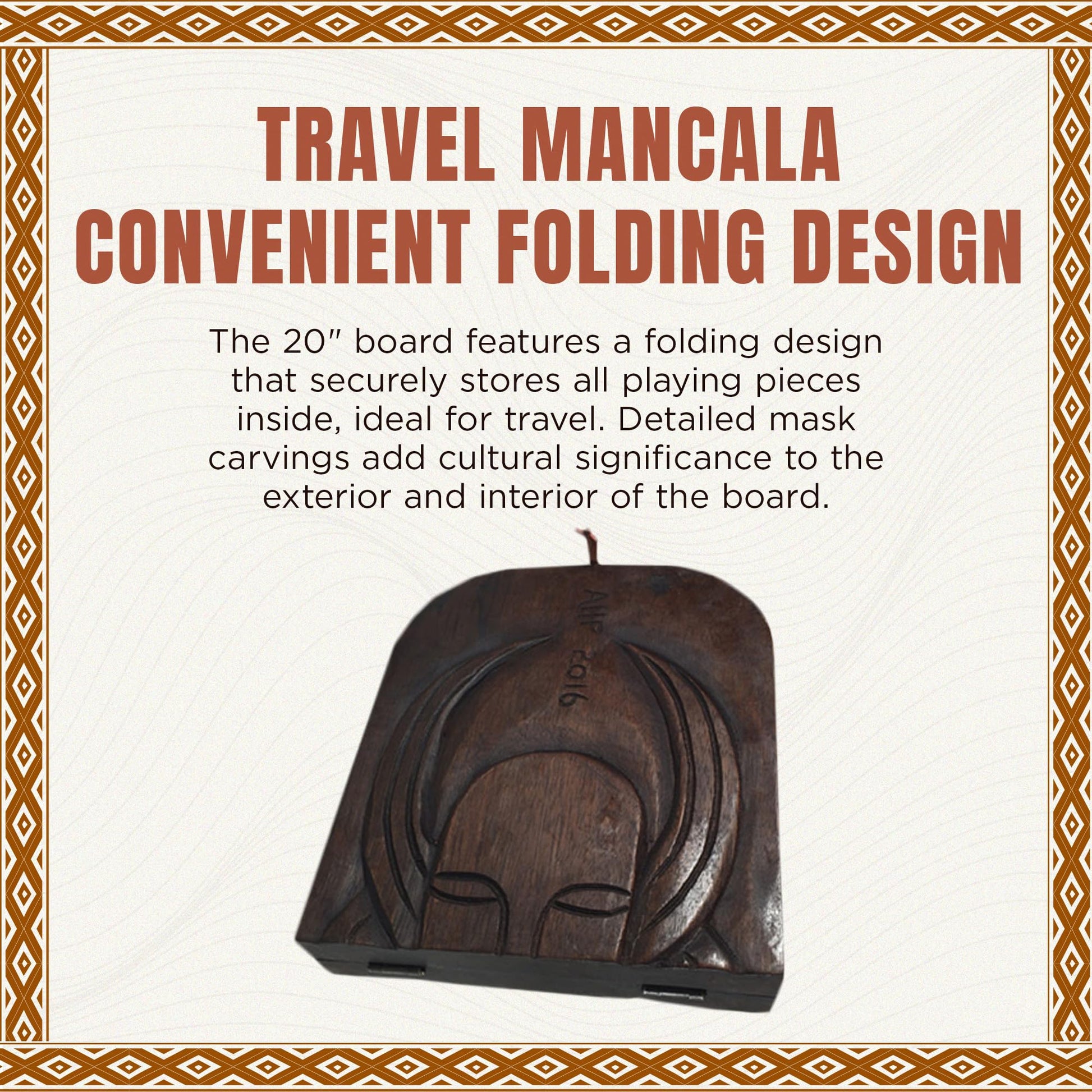 - TRAVEL MANCALA - CONVENIENT FOLDING DESIGN: The 20" board features a folding design that securely stores all playing pieces inside, ideal for travel. Detailed mask carvings add cultural significance to the exterior and interior of the board.