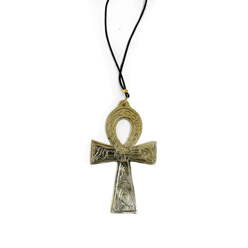 Be bold and completely exotic with this gleaming brass ankh necklace. Leather necklace is adjustable from 24" to 38" long. Pendant is nearly 6" long and features detailed engravings. Ankh pendants are the same as photo; but some beads on band may vary slightly.