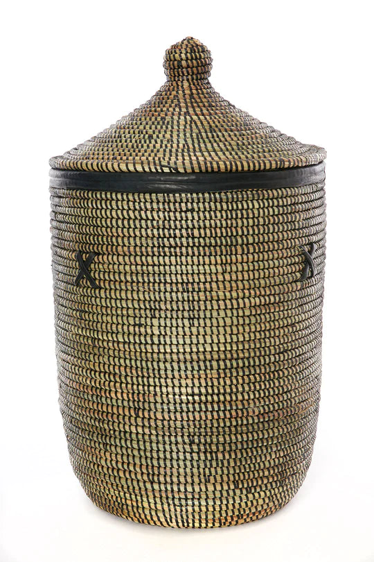 Talented Wolof women in rural Senegal utilize abundant cattail stalks and strips of salvaged plastic into beautiful storage hamper baskets for the home. The largest hamper includes leather trim, and leather ring handles. The smallest basket has leather trim only.