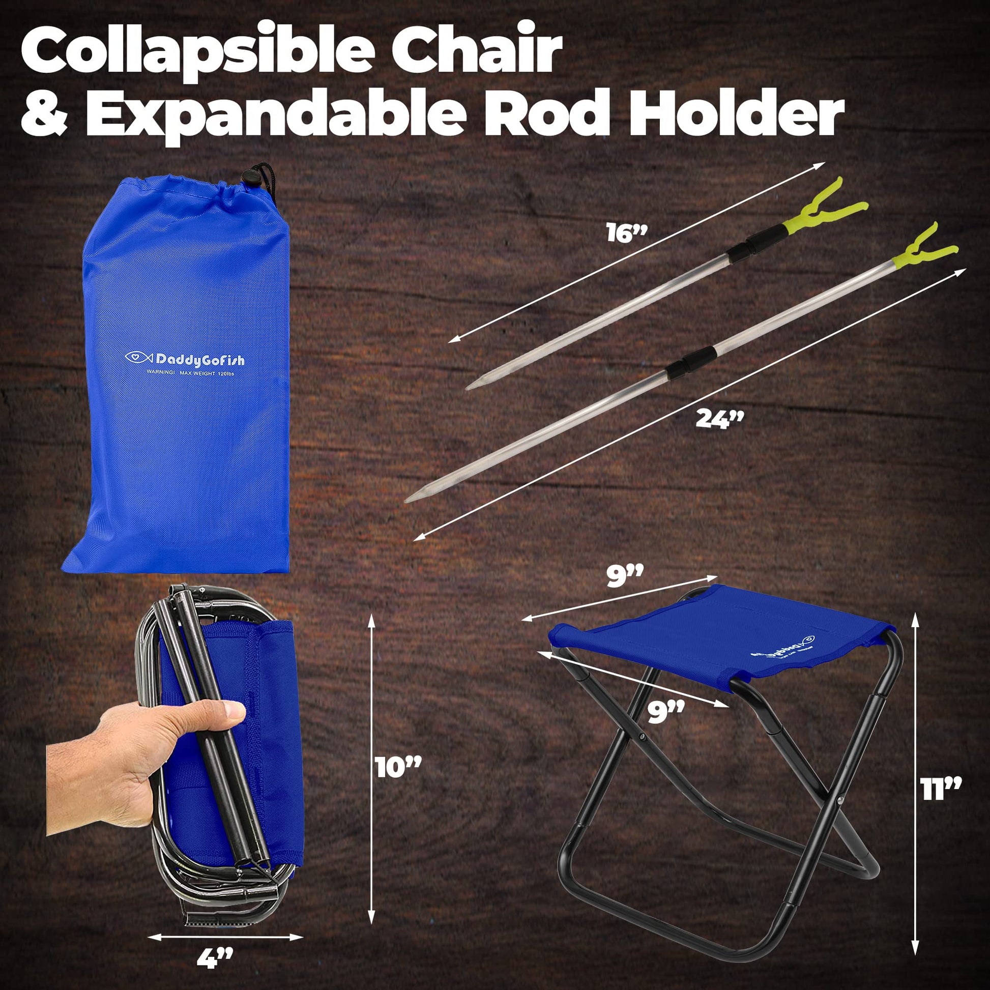 - COLLAPSIBLE CHAIR AND ROD HOLDER - Kids have a place to rest wherever they go. The rod holder keeps the fishing pole off the ground and minimizes the chance of accidental damage.
