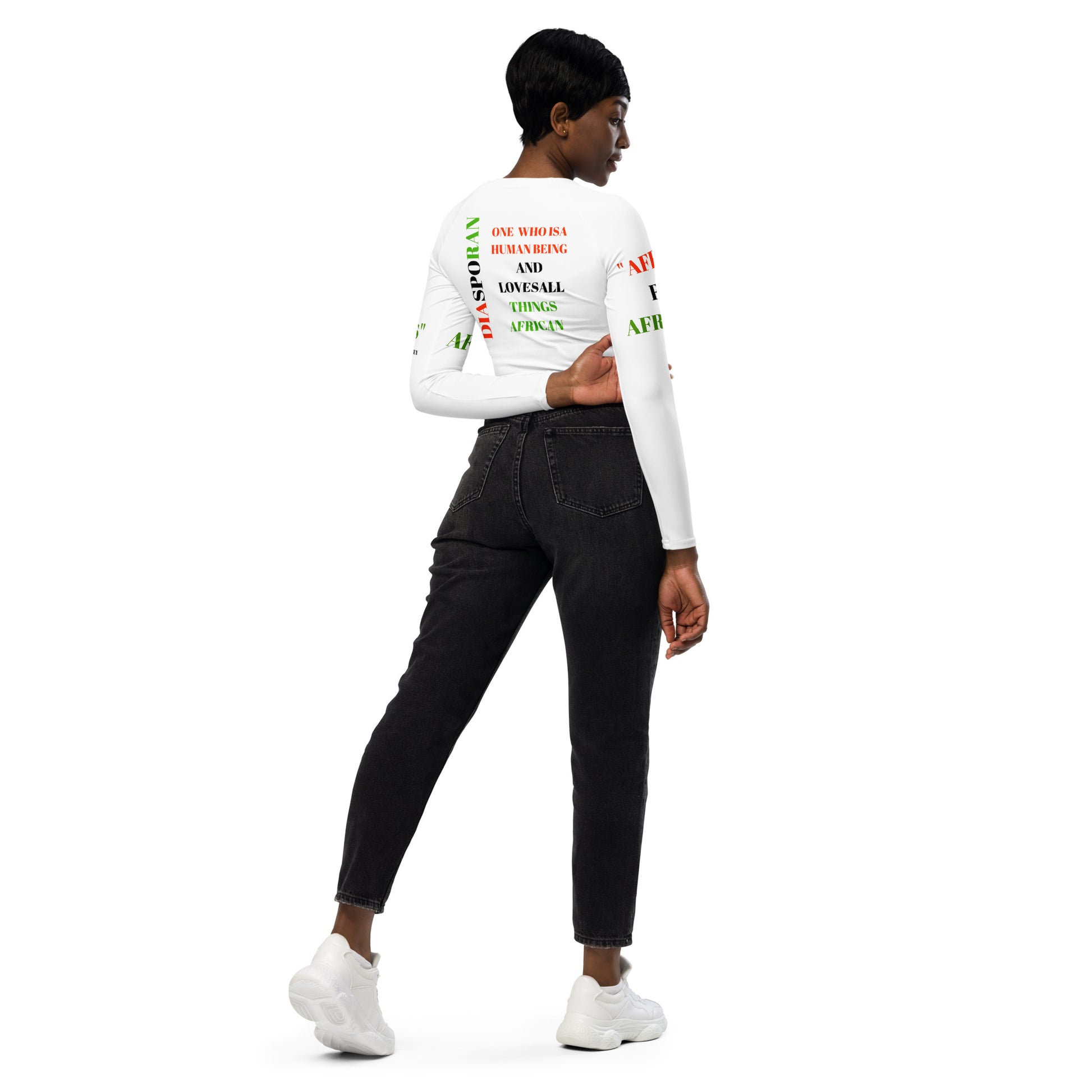 This DIASPORANS All-Over Print Recycled Long Sleeve Crop Top by SobG Designs is made of recycled polyester and elastane, making it an eco-friendly choice for swimming, sports, or athleisure outfits. The crop top has a tear-away care label and a wide, double-layered waistline band for a comfortable fit.