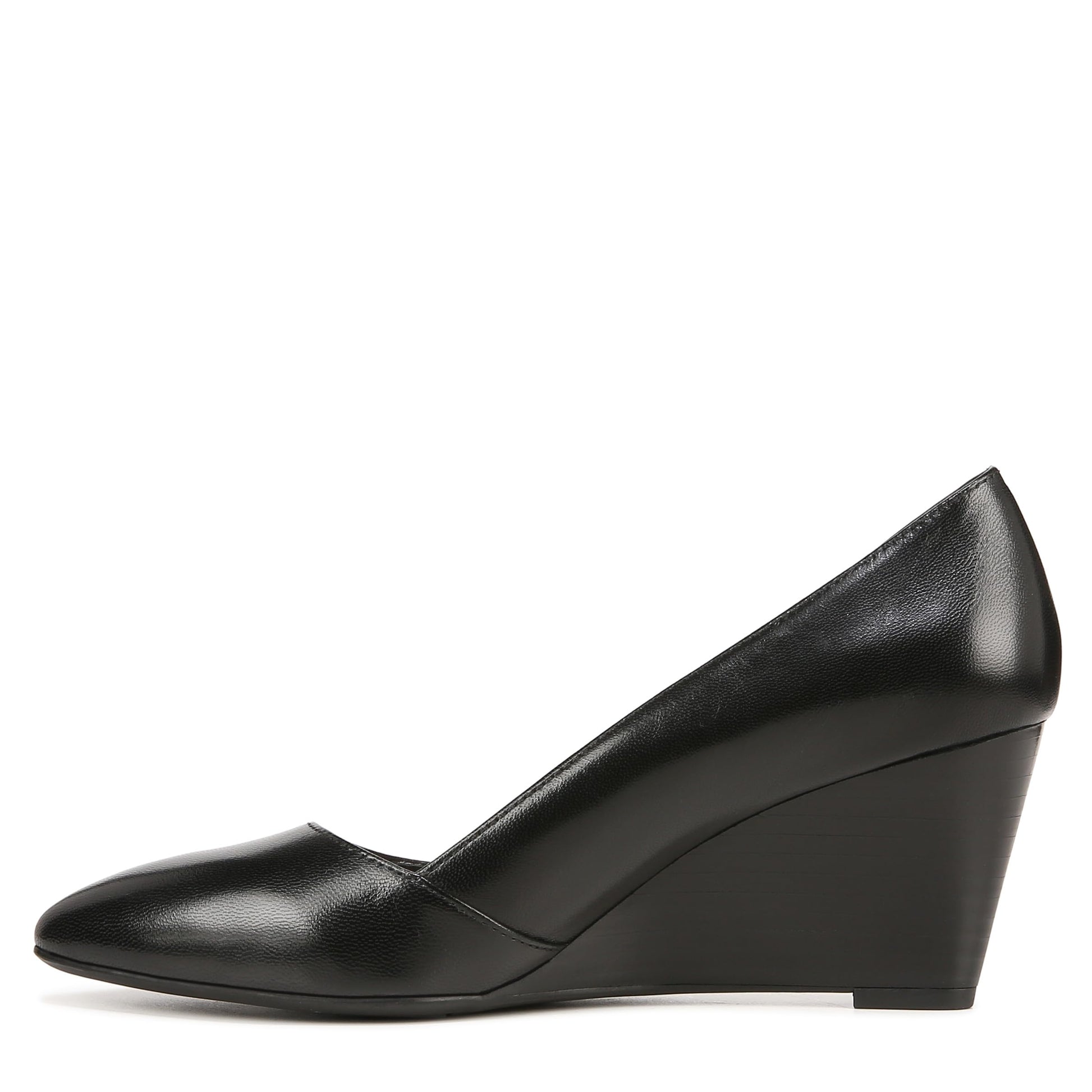 A classic yet modern approach to your pointed wedge heel. Leather upper. Slip-on fit for easy on/off. Pointed toe. Modern and sleek silhouette. 2.5 inch wedge heel.