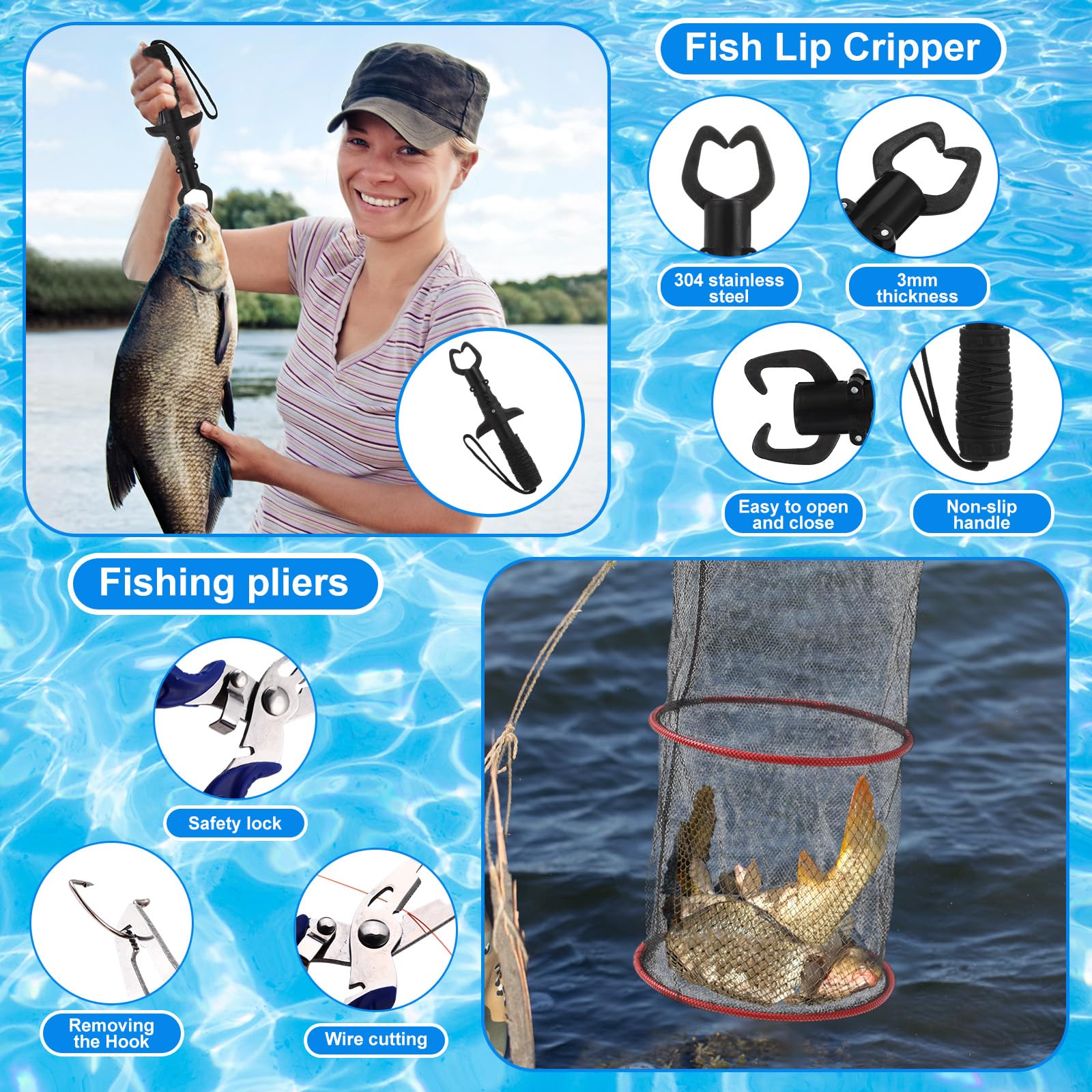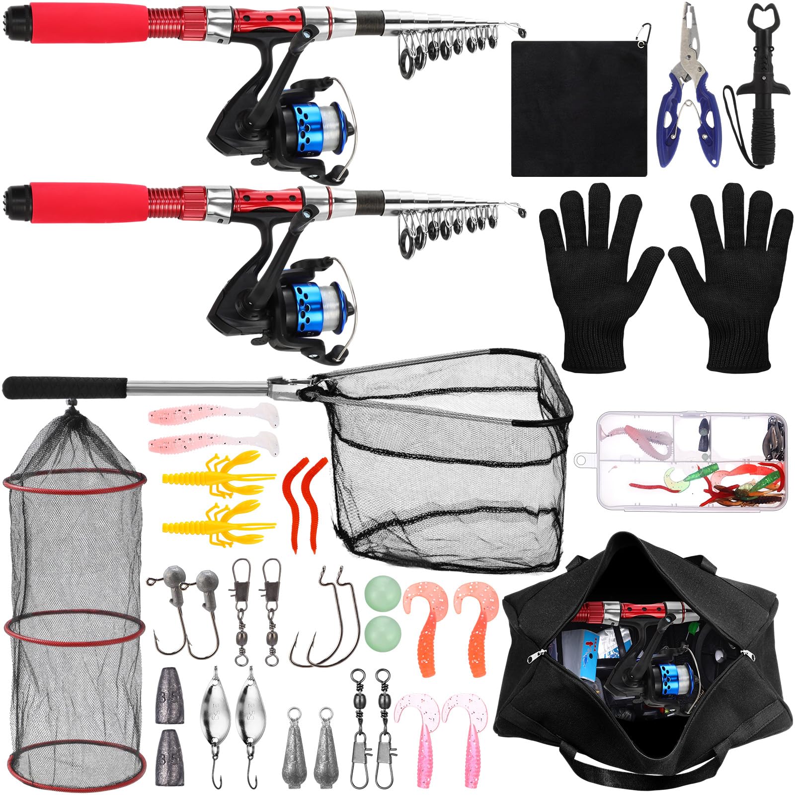 - Complete Fishing Equipment for Beginners: this fishing set includes 2 red telescopic fishing rods, 2 spinning plastic fishing reels, 1 hook remover, 1 fish clamp, 1 scissors, 1 pair of cut-resistant gloves, 2 fishing reels, 2 sets of baits, 1 scoop net, 2 fish cages/1 hook towel and a portable bag, which can accommodate all the fishing equipment needed by beginners, Suitable for beginners and experienced anglers