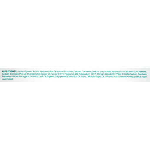 Water, Glycerin, Sorbitol, Hydrated silica, Dicalcium Phosphate, Calcium Carbonate, Sodium lauryl sulfate, Xanthan Gum, Cellulose Gum, Menthol, Sodium Benzoate, PEG-40 Hydrogenated Castor Oil, Flavour, Poloxamer 407, Tetrasodium EDTA, Titanium Dioxide (CI 77891), CI 77266, Sodium Saccharin, Potassium Nitrate, Eucalyptus Globulus Leaf Oil, Eugenia Caryophyllus (Clove) Bud Oil, Salvia Officinalis (Sage) Oil, Ascorbic Acid, Charcoal Powder, Streblus Asper Leaf Extract, Flavor Mint