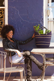 Midnight Blue Pinstripe Bolga Set of Three (3) Shopper with Leather Handles
