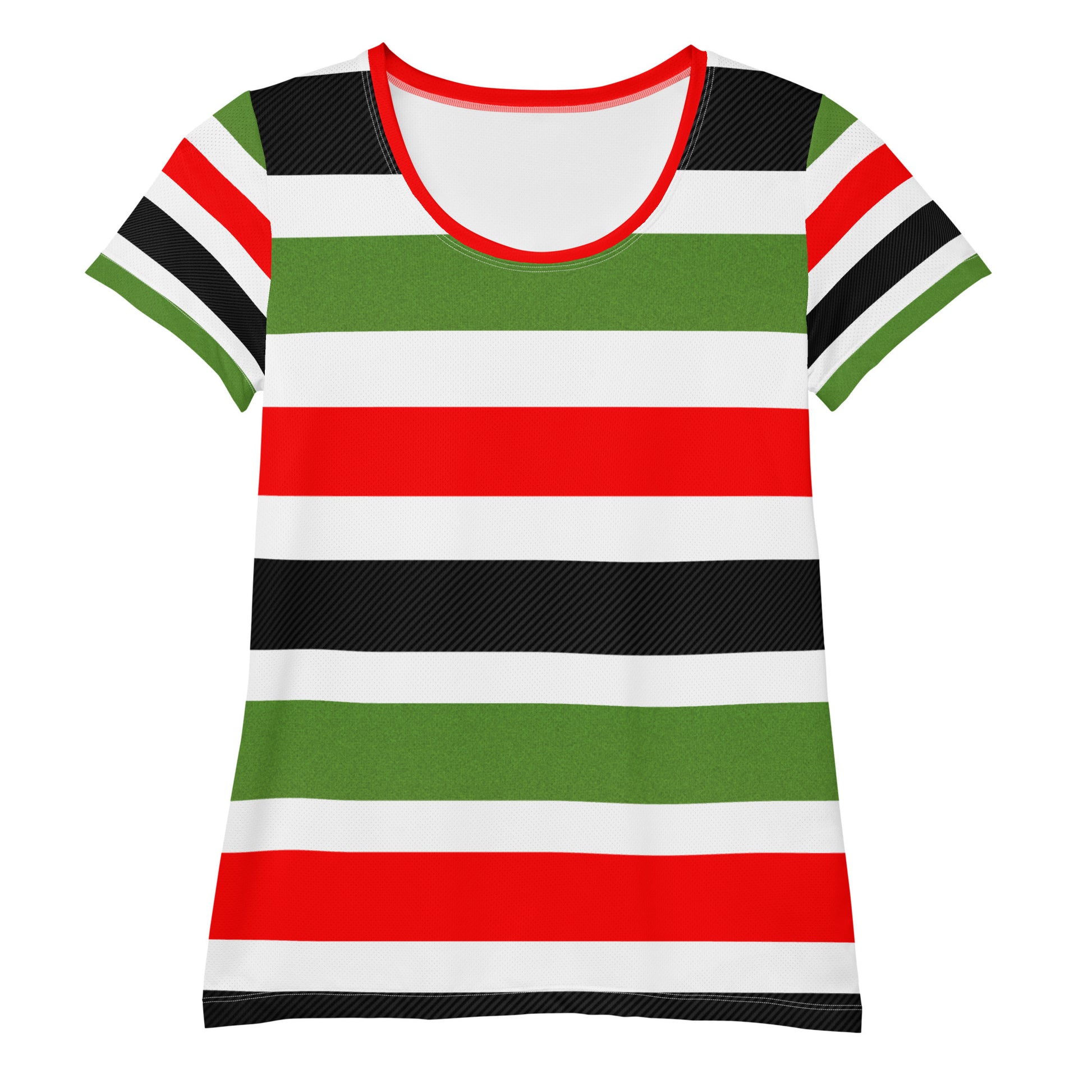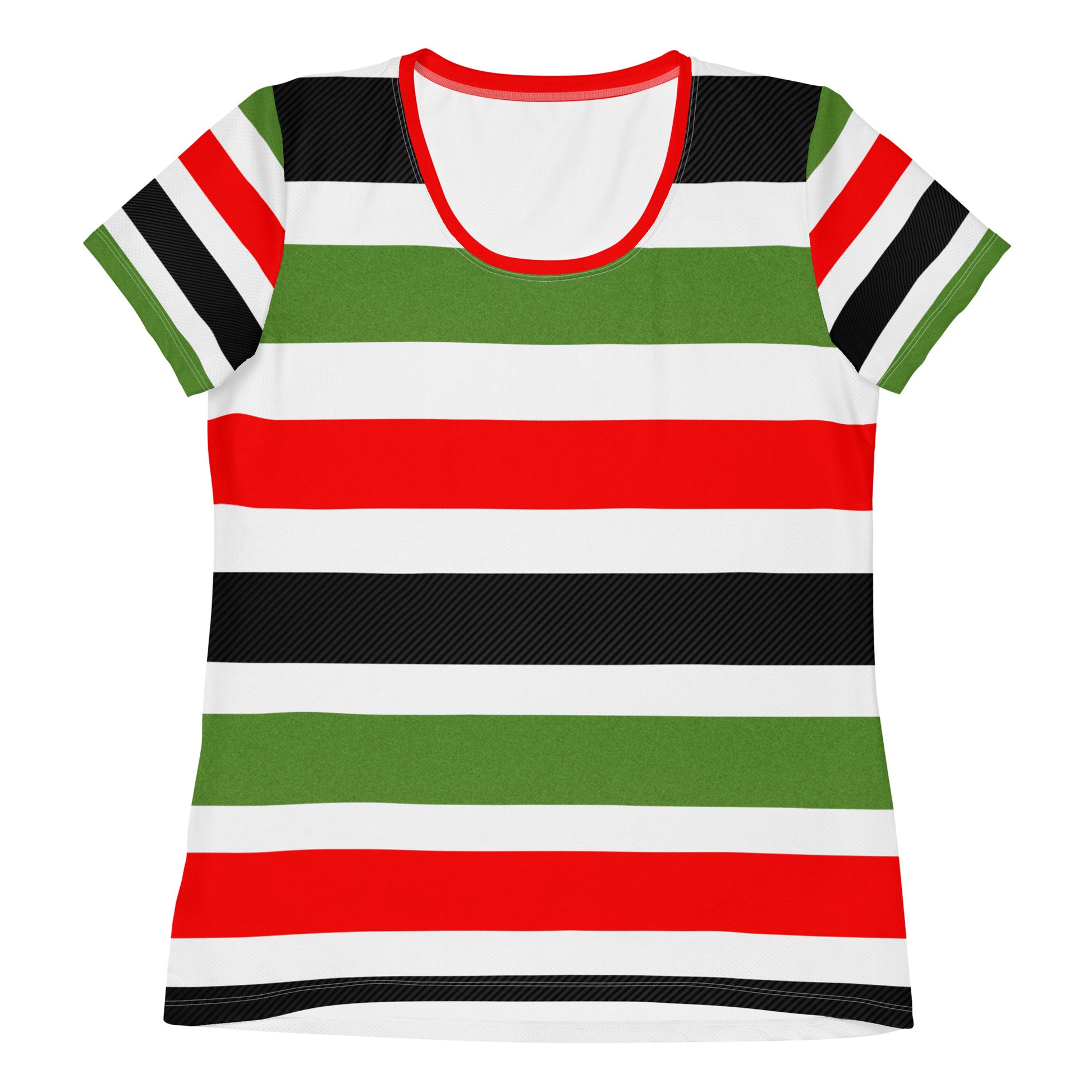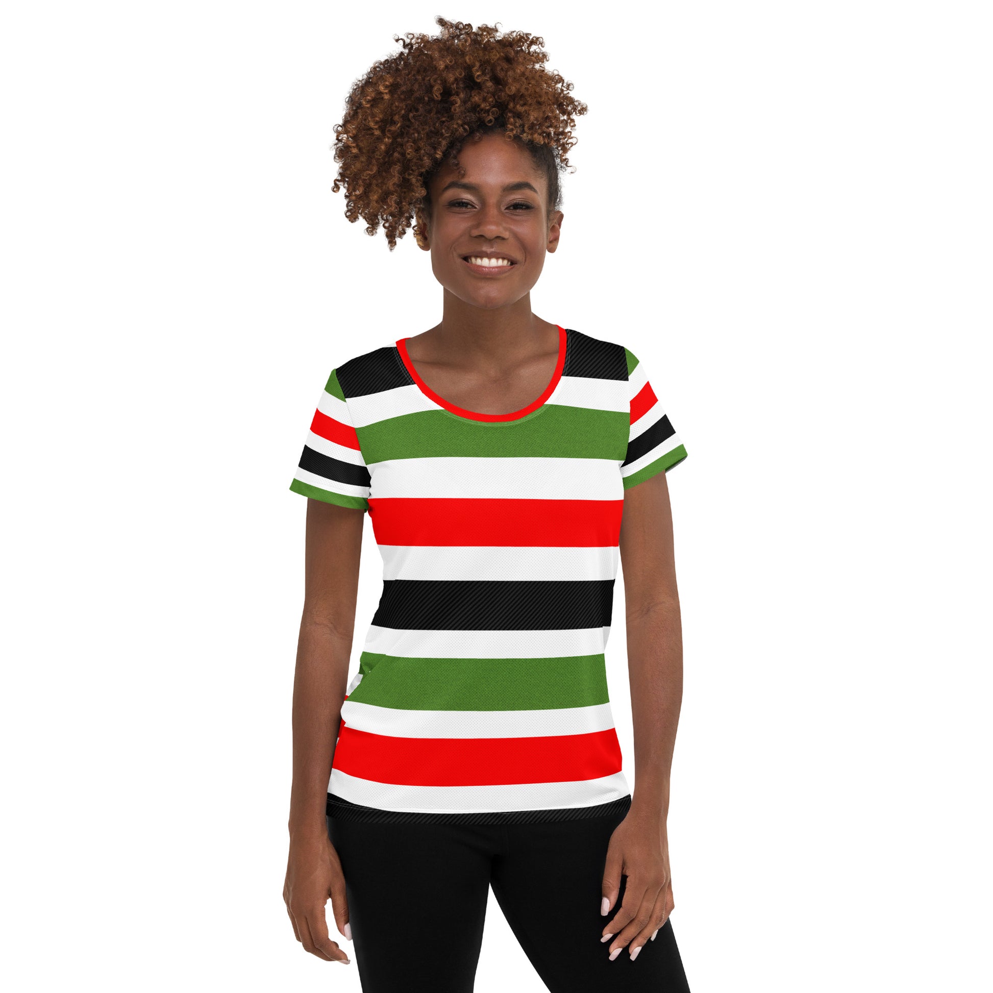 This PAN-AFRICAN STRIPE All-Over Print Women's Athletic T-Shirt by SobG Designs easily combines comfort and style—the sports mesh fabric with moisture management is sure to keep any athlete dry and comfortable during exercise, while the design will make it into a unique statement piece.