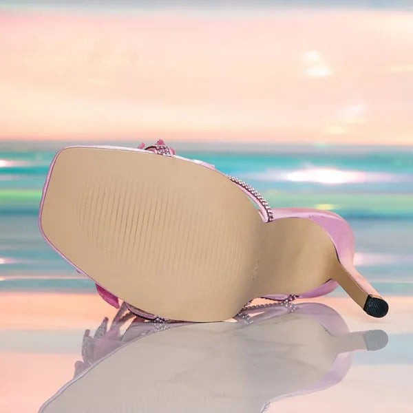Pink PU Casual Rhinestone Decor Flower Shape Square Out Door Shoes High Heel Sandals