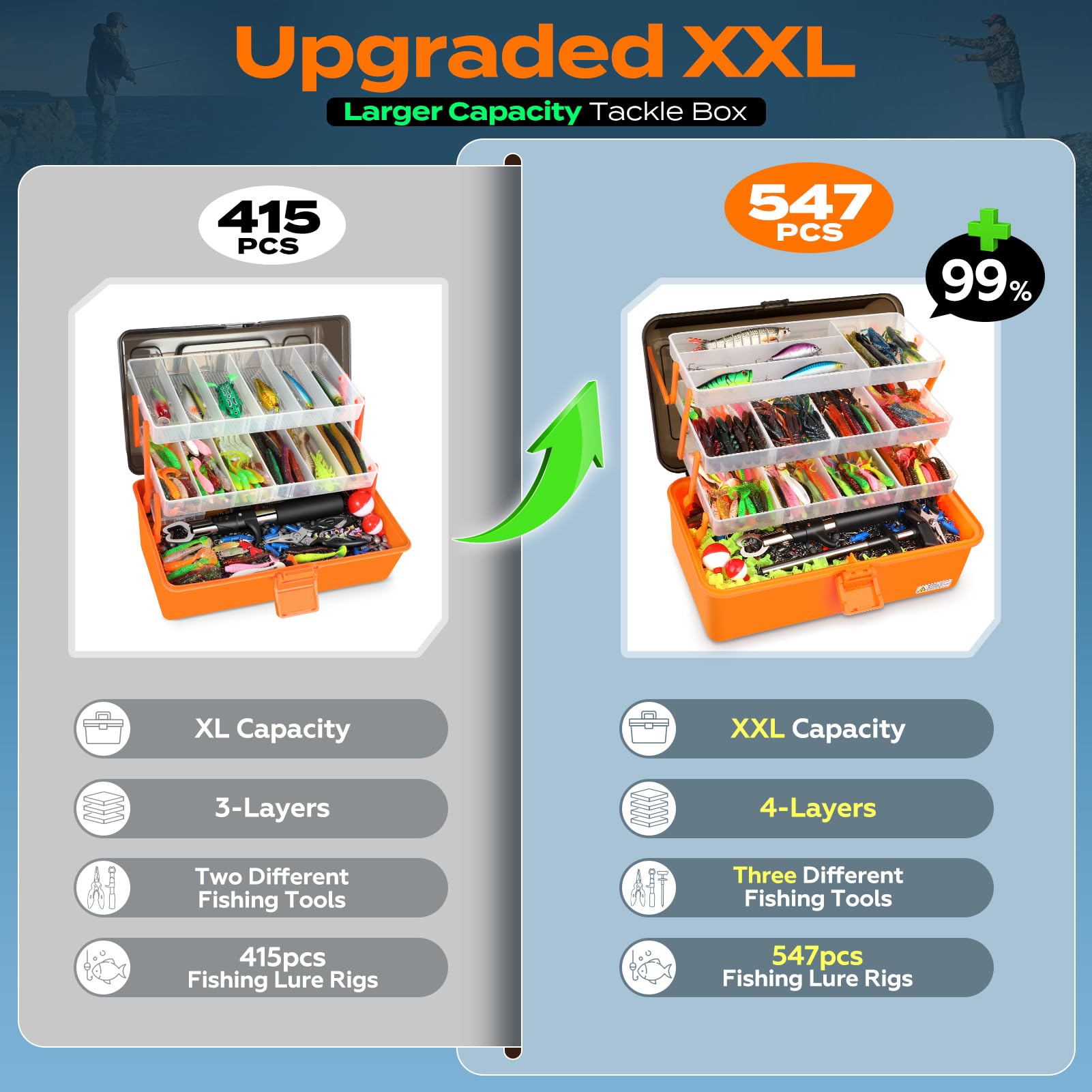PLUSINNO Large 4-Layer Tackle Box with Tackle Included, 547Pcs Fishing Lures Kit - Pliers, Crankbait, Hooks, Weights & Accessories - Freshwater Bass Fishing Bait Lure Gear and Equipment, Gift for Men