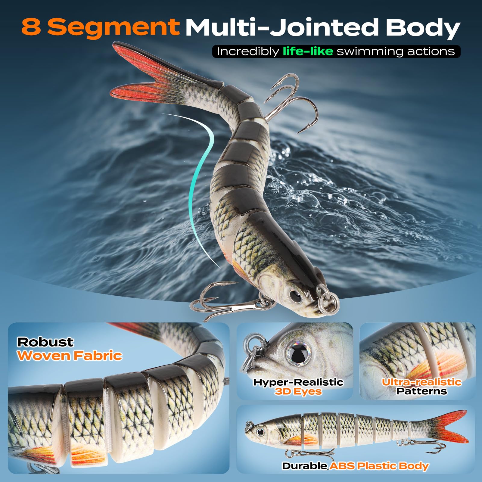 - 【Exceptional Fishing Tackle Kit】- Includes 4 lifelike lures (Swimbait, Popper, Crankbait, Minnow) with 3D realistic looking eyes and pearl powder coating for ultra-realistic underwater appeal. The 8-segment articulated design achieves slow-sinking action and move flexible that the lifelike swimming action, proven to attract predator fish like bass and trout. Pair it with stainless steel fishing gear such as pliers and fish controllers to make every freshwater fishing trip a full one!