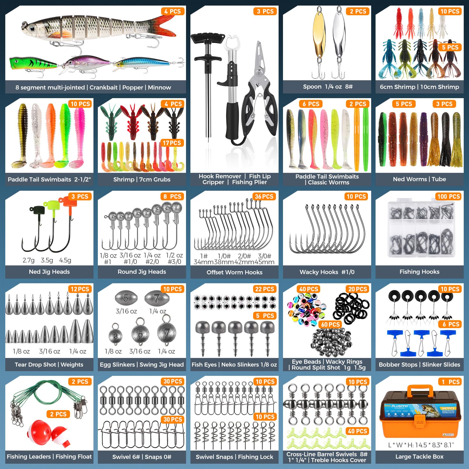 - 【Ultimate All-In-One Fishing Gear】 – This complete fishing kit has everything you need – pliers, fish gripper, hook remover, 544 premium fishing accessories (62 soft lures, 146 hooks, 11 jigs etc ), upgrade to build 16 pro rig combos like Texas/Carolina/Drop Shot – 50% more setups than standard fishing tackle! No extra purchases, no wasted prep time. Organize once, fish all day with battle-ready multi-segment swimbait, crankbaits, and 87 sinkers. Hassle-free prep for spontaneous trips