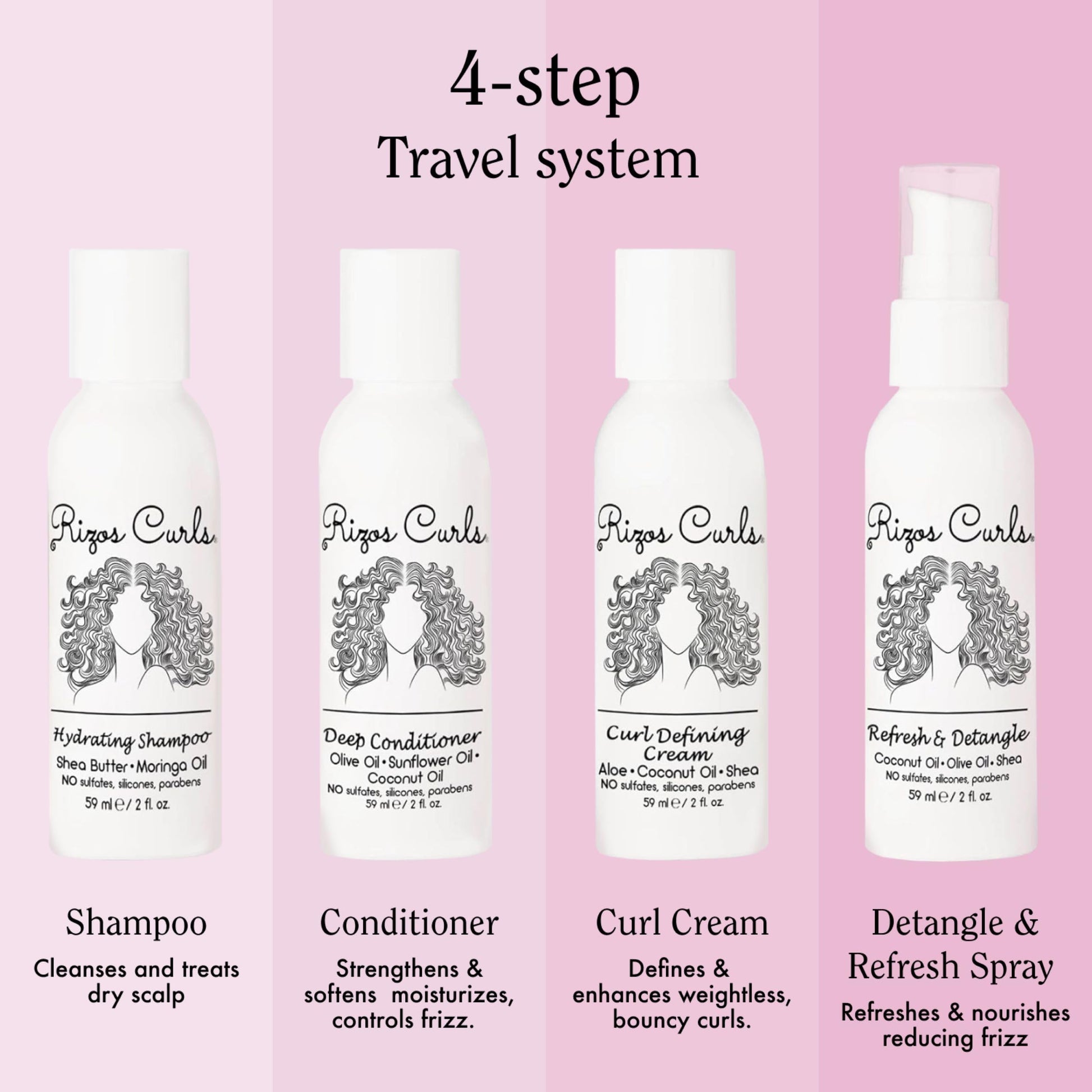 Rizos Curls 4-Step Travel Kit for Curly Hair: Curl Defining Cream, Shampoo, Conditioner, Refresh & Detangle (2 fl oz each)