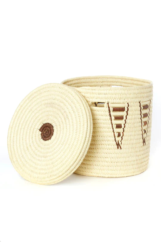 These beautiful handcrafted hampers showcase the talent of rural Turkana basket weavers in dry northern Kenya. The doum palm, also known as the gingerbread tree, grows throughout the Turkanalands, and produces long leaf stalks that can be harvested regularly for basket weaving. Since trucking the baskets down to Nairobi can be a complicated process, baskets are sold as a nesting set to efficiently preserve space. These durable storage baskets are crafted to serve beautifully in any room of the home for years.