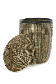 Talented Wolof women in rural Senegal utilize abundant cattail stalks and strips of salvaged plastic into beautiful storage hamper baskets for the home. The largest hamper includes leather trim, and leather ring handles. The smallest basket has leather trim only.