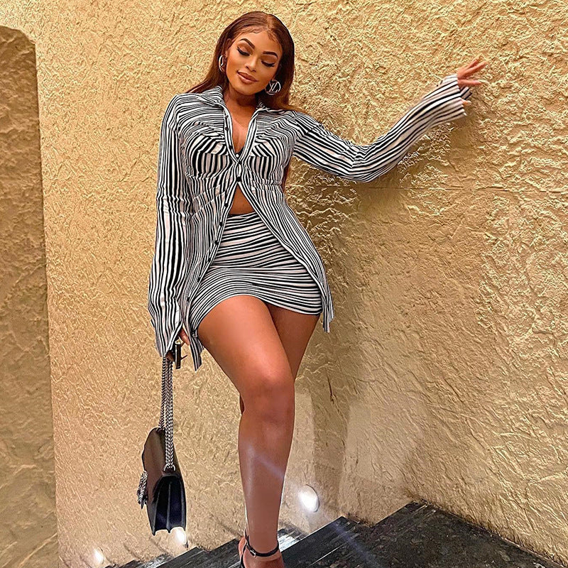 Striped Shirt with Polo Collar and Mini Skirt Fashion Suit