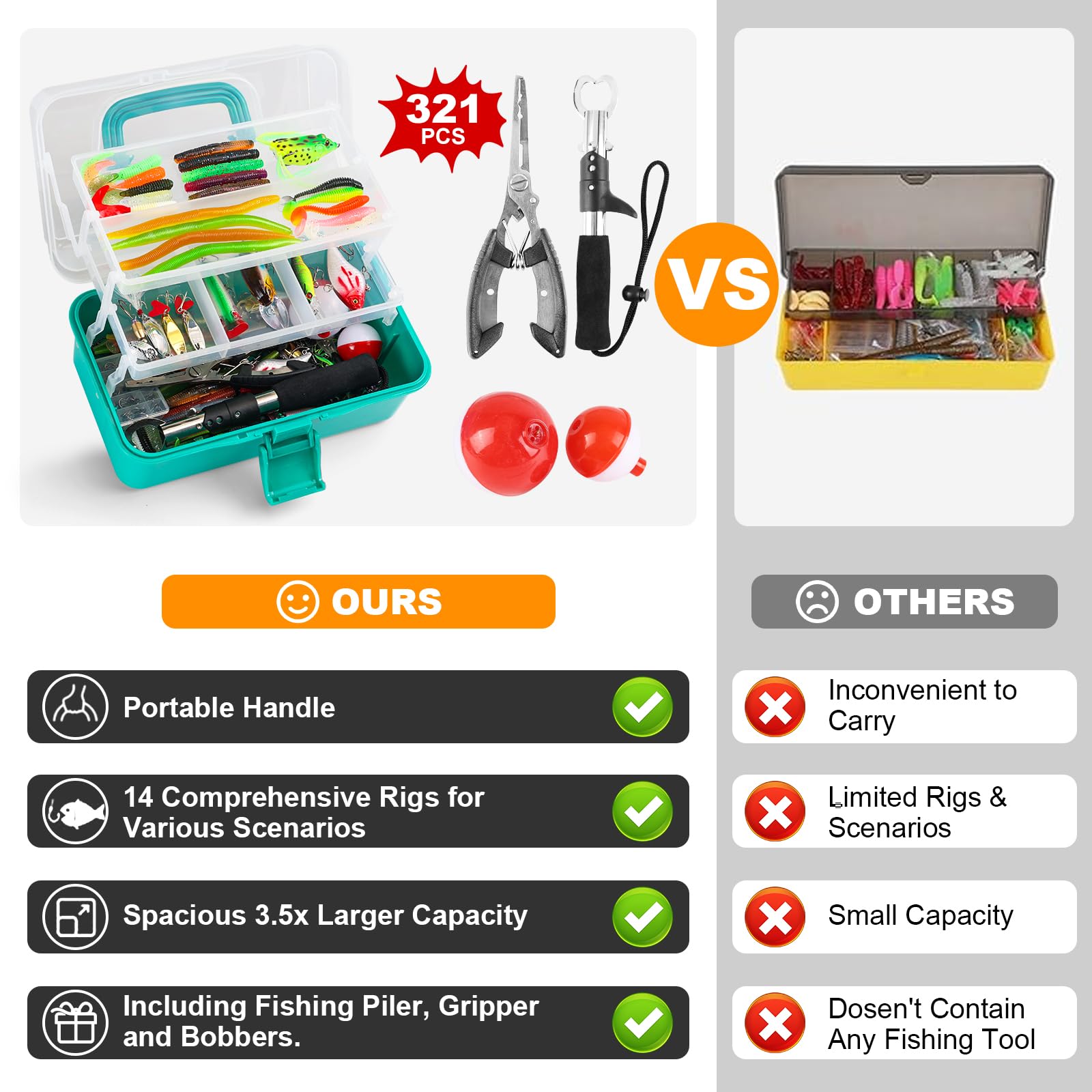 TCMBY 3 Layers Tackle Box with Tackle Included, 321Pcs Fishing Lures Kit Contains Pliers, Crankbait, Hooks, Weights & Accessories, Fishing Gear Bait Lure Gifts for Men Bass Freshwater (Green)