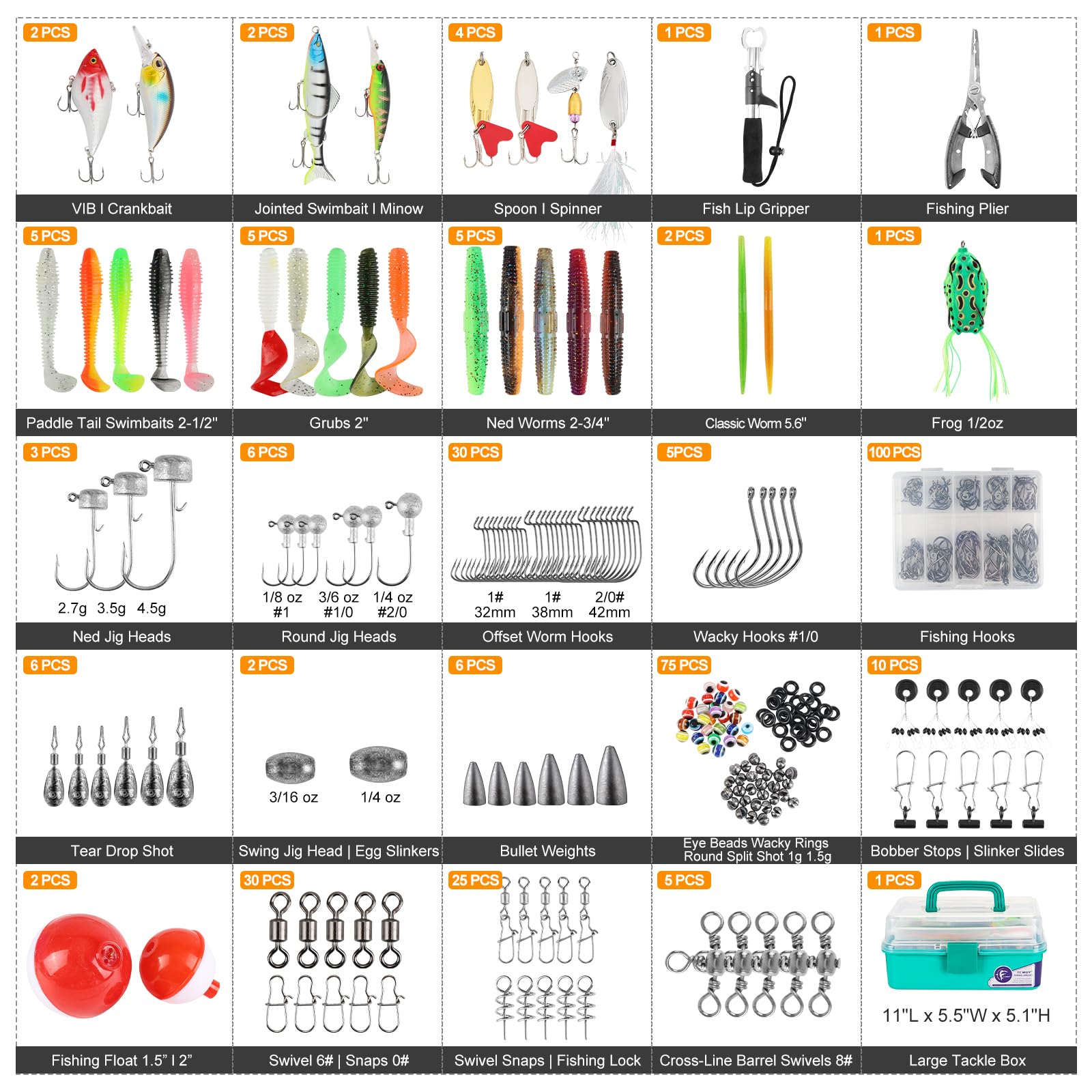 - 【Comprehensive Fishing Kit】 - It's a complete package with essential tools like pliers and a fish gripper, plus a full set of fishing accessories. It simplifies preparation, making fishing more hassle-free for impromptu trips. The tackle box with tackle included 1 plier and gripper, 2 crankbaits, 1 popper, 1 minnow, 1 pencil, 1 frog, 36 soft lures, and a box of 100 fishing hooks. It also features 40 offset worm hooks, 13 jig heads, 79 weights, and more to cater to diverse fishing needs.