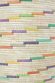 Wolof women in the West African nation of Senegal update traditional coil weaving methods by enlivening natural grass baskets with colorful strips of plastic salvaged from a mat factory. Cattails grow abundantly in rural Senegal, so women can earn a sustainable income from basket weaving while enriching homes around the world with modern African craftsmanship.