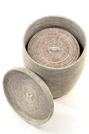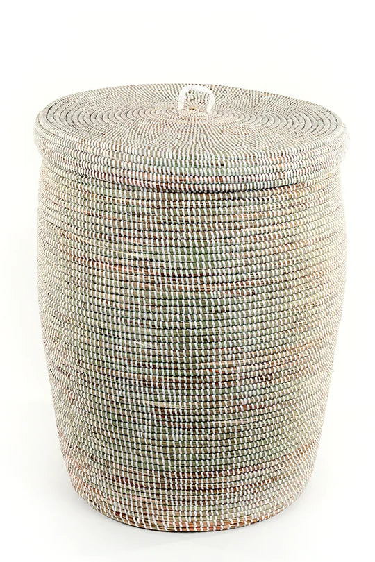 African laundry hampers bring amazing artisan craftsmanship into our living spaces. This simplified hamper duo features a straight silhouette, a snug overlapping lid and a braided handle.